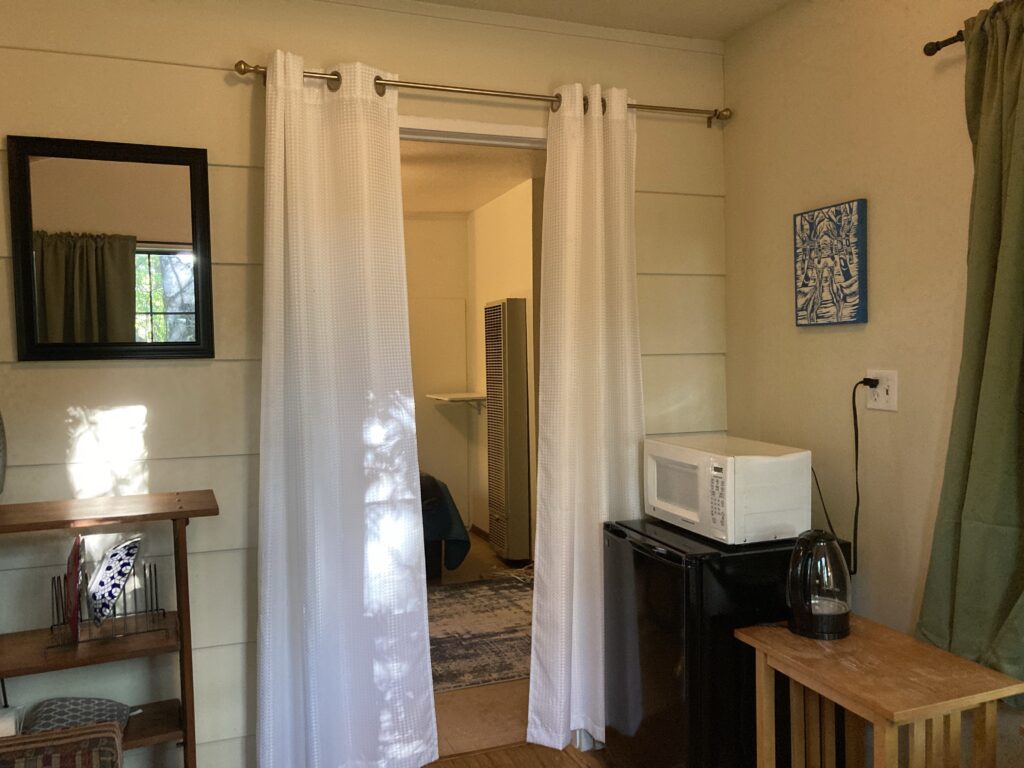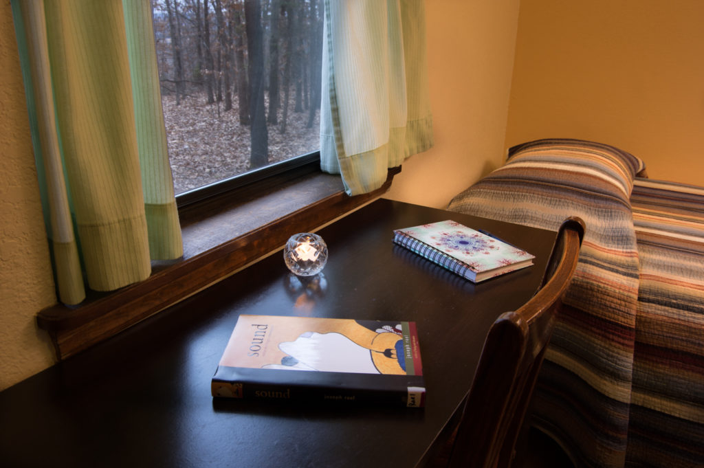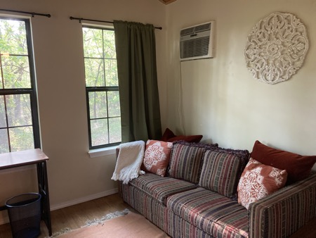 Our Guadalupe hermitage cabin is located in a private spot with big picture windows for looking out at the forest. This cabin features two rooms, one with a sofa. A private porch is perfect for experiencing the wonder of the forest in solitude.