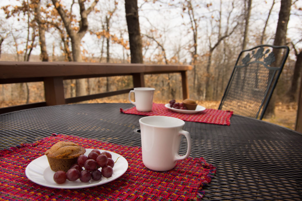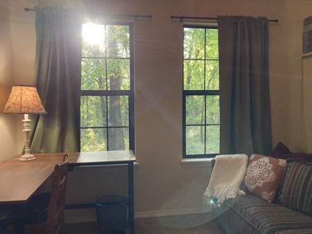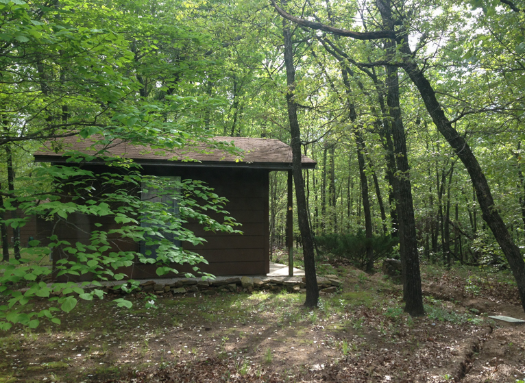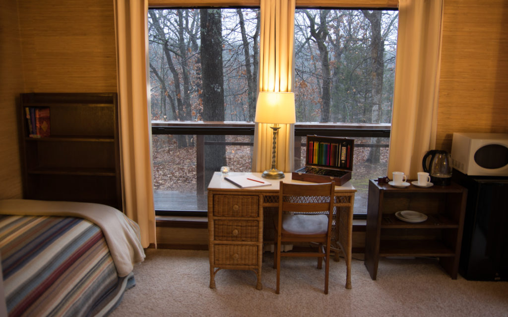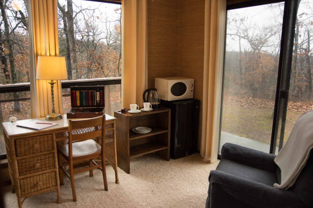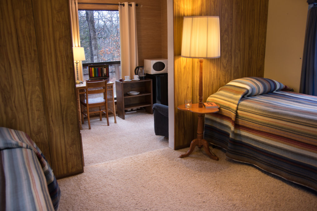 Our Subiaco hermitage cabin is located in a private spot with big picture windows for looking out at the forest. This cabin features two rooms and a larger bathroom. There is a microwave, small refrigerator, plates, mugs, and eating utensils. A private deck is perfect for experiencing the wonder of the forest in solitude.