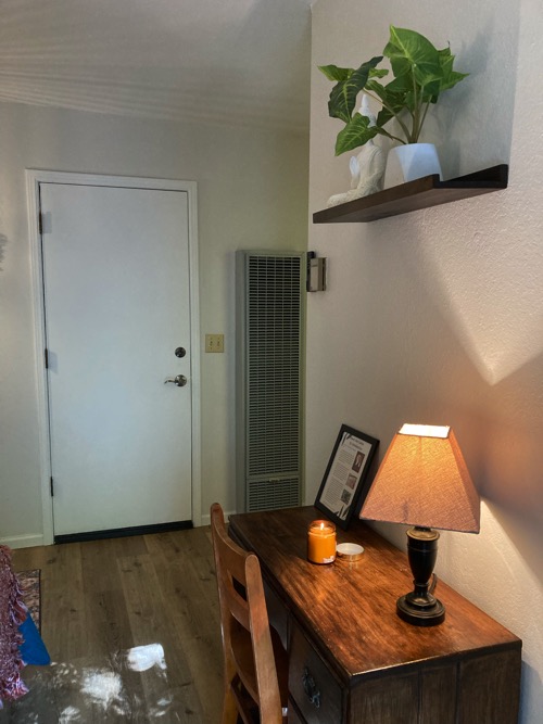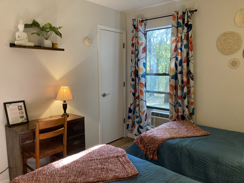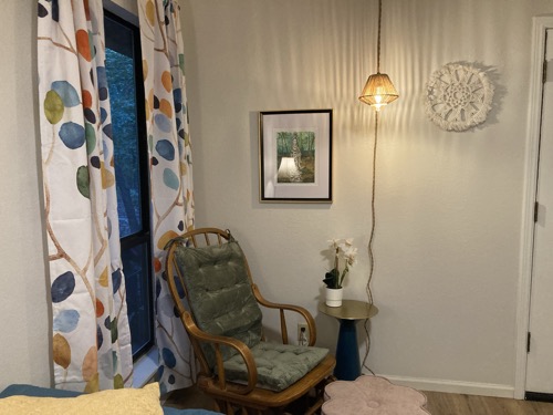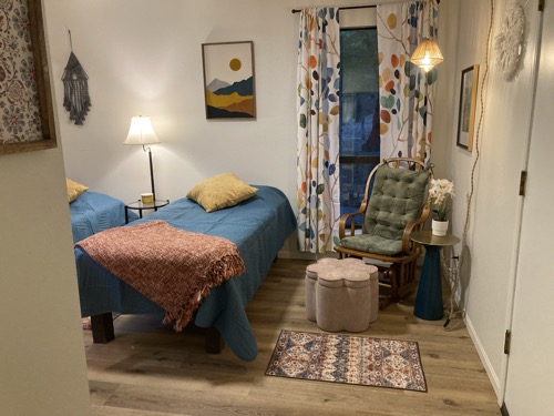 It has new flooring, paint, and fixtures, along with gorgeous new curtains, bedspreads, and decorations. This space is light, bright, joyful, and colorfully soothing.